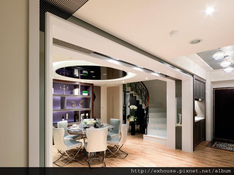 為成就樓上和室的高度,餐廳天花板明顯有壓迫感。為讓天花板在視覺上有向上延伸的效果,偕志宇以圓型天花板搭配間接照明設計,讓空間壓迫感降低,再以灰鏡反射,讓天、地間的距離放大。餐廳展示櫃兼酒櫃的背牆選用紫色壁紙襯托,搭配燈光照明設計,讓空間質感倍增。