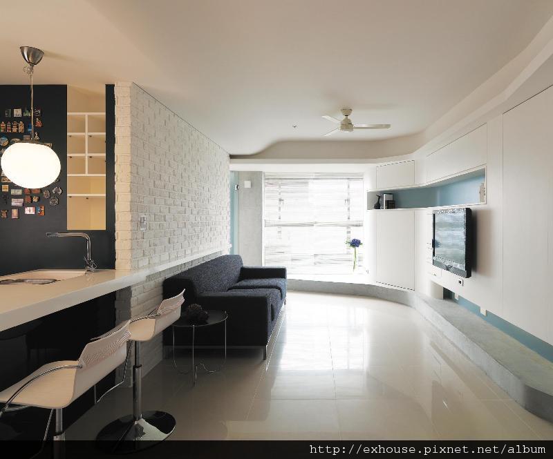 進門處,主牆內部隱藏了收納機能,流線性的造型一路延伸,加上光的導引,連結了玄關、客廳、客浴三者的關係。主牆色彩以白色為主,凹面利用藍色色塊,表現立面的層次感。由主牆延伸而出的平台式臥榻區,同樣以流線線條做出呼應,質樸材質映襯出隨性的生活態度,也為家人與來訪友人闢出一塊舒適互動的空間角落。