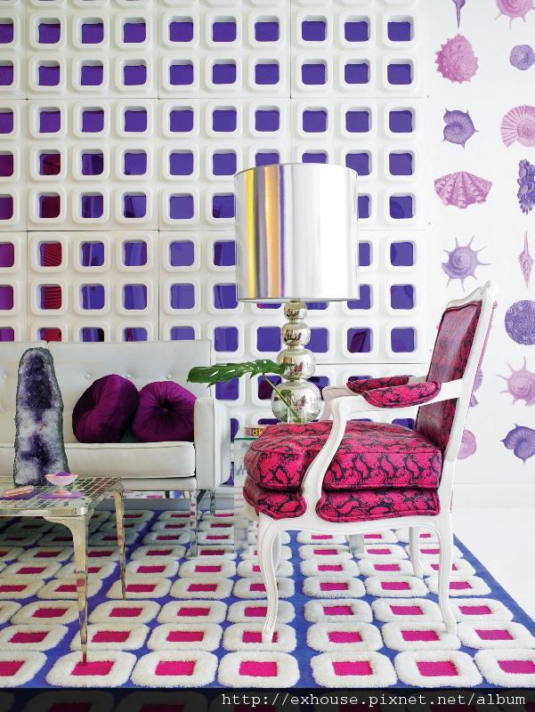 光看這張照片就覺得張力效果十足,原因是相同語彙讓客廳牆壁與地板連成一線。設計師在牆壁使用紫色鏡面材質,搭配鏤空方格裝飾壁板,比壁紙更有獨創性;到了地板同樣延續相同語彙,底色為紫色,上頭的白色方框裡包覆桃紅色,兩者相輔,成功締造客廳氣勢,也讓整體更加完整。