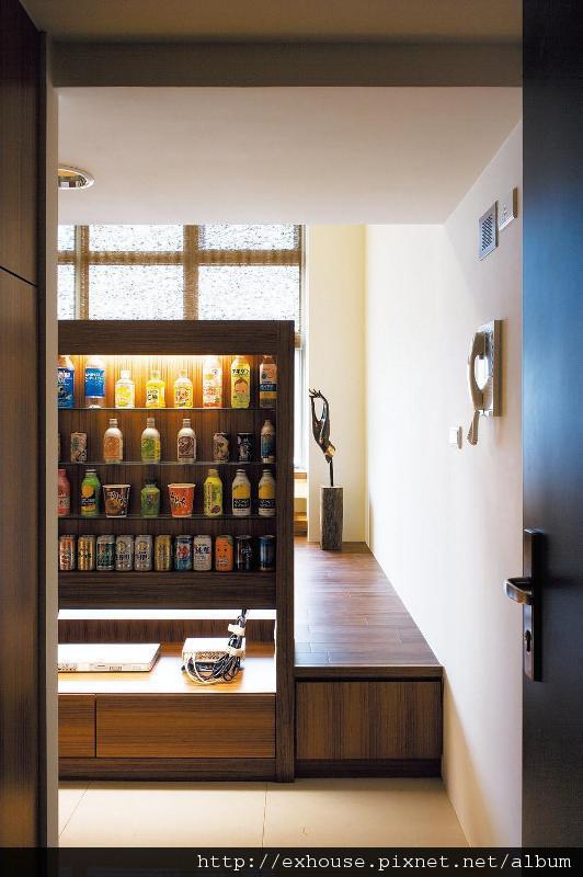 設計師特別在玄關門口設置了精緻的展示櫃,讓喜愛旅行的屋主夫妻可以擺置寶貝紀念品,也讓訪客一進門就能分享主人珍藏的旅行記憶。