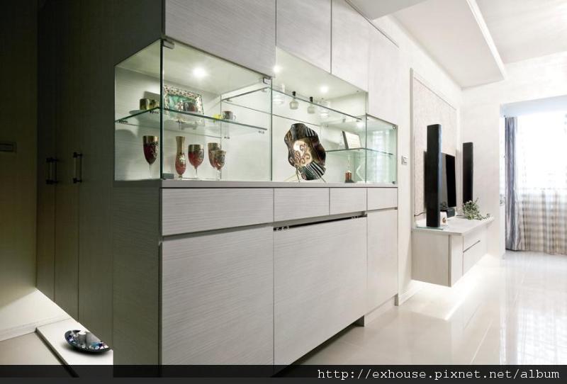 利用系統櫃與木作結合,設計收納充足的玄關櫃與展示櫃。
