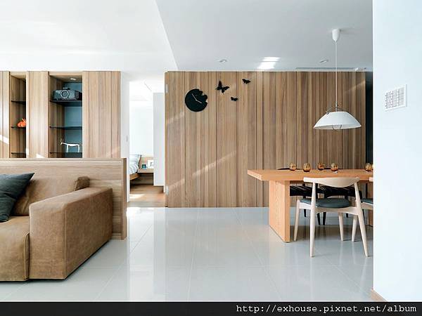 整面的自然木質紋理,如旋律般的層次,讓簡約的白色公共空間更有內涵,也成為本案中最具焦的居家風景。