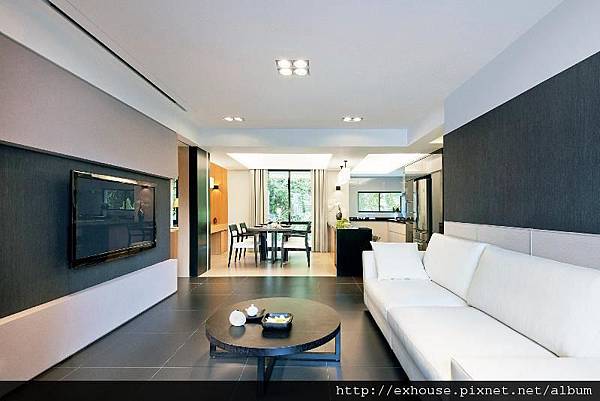 客廳與餐廳藉由不同深淺的黑與白,排比出層次與對比,讓空間更有節奏感。