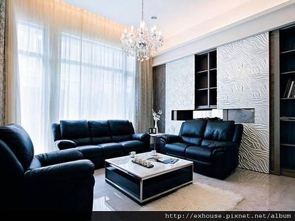 屋主希望家中的設計不要與一般的房子相同,特別希望電視牆能有較為特殊的呈現。設計師陳億庭再三考慮後,結合隔間的機能性概念,在客廳與餐廳之間以大理石牆作為電視牆的主視覺,而可旋轉的電視,同時滿足兩個空間的視聽需求。沙發背牆的隱藏櫃體,有大容量的收納空間,門片採用雕刻板材質,亦同時創造出獨特的視覺美感。
