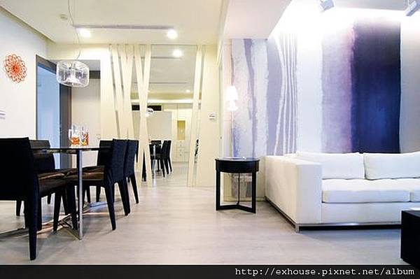 「簡單、明亮、具有設計感」 是屋主對於風格的最大訴求,經過多次的溝通與討論,魏紀如以具有藝術性格的現代風格包裝整個空間,從公共空間到私密空間皆以白色為主要基調,利用局部牆面進行色彩變化、增加線條與各類藝術圖騰,例如在沙發背牆即運用色塊與線條明顯的彩繪壁紙,餐廳面對的牆面覆蓋整面玻璃,瞬間營造公共空間的藝術氣質和寬敞感受。