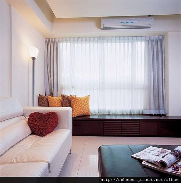 在客廳靠窗處設計了觀景窗台臥榻,精心拿捏的高度與尺寸除了考量到可當作喝茶、閱讀的空間之外,下方隱藏的收納機能也將空間的效能提升到極致。