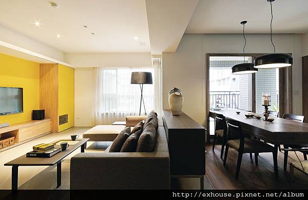 設計團隊並未大幅變更原始配置,僅在重點 局部變更。公共區域採一半木地板,一半拋光石英磚調整室溫。將客廳與書房餐廳二合一的空間,整合成一個主要的公共區域,並以訂製的義大利柚檀實木貼皮木作矮櫃相隔,界定空間同時維持視覺上的穿透感。