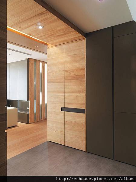 生活用品、設備等依規格、使用方式,一一退隱於櫃牆,成就清隱和寂的日式風格住宅。和風神韻是從屋主旅行日本的記憶中粹取而出,結合西方極簡風格的簡單形意,室內運用大量的原木材質,質樸的風化木、栓木洗白、橡木直紋等木皮,穿插交錯,搭配沙發後那一面藏青色烤漆牆,在空間重溫旅途中的美好回憶。