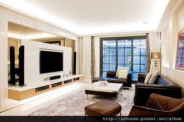 至於針對新古典風格和鄉村風格的融合,則以新演譯方式來呈現,前者以客廳為例,以獨特大面線板烘托,表面還浮雕出立體線條層次,看似隨意置於壁面,但卻是散發一種淬練過後的古典味道;電視牆也選擇以大理石來鋪陳,自然細緻的紋理,低調而溫柔的中和全室色溫,讓古典氛圍再度以不同方式做到渲染與擴張。而鄉村風格的質樸則是在2樓起居間表露無遺,布質沙發、單椅與窗簾布料相輝映,醞釀悠閒的鄉村風情,大量木質櫃多少也讓風格更形質樸與手作感。