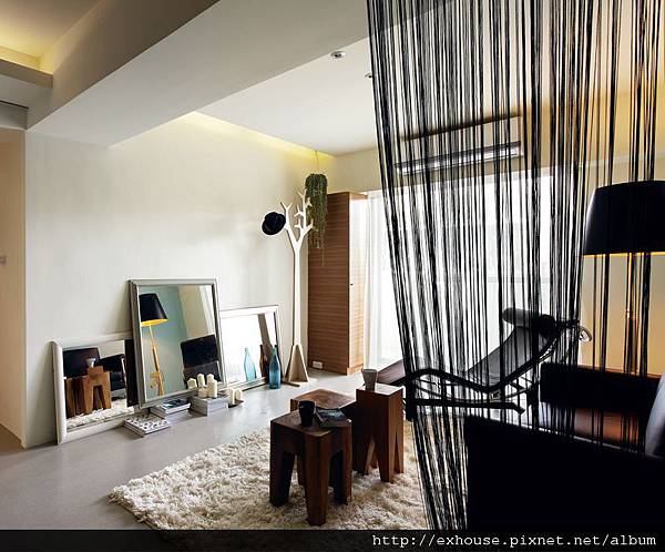 至於,挑高兩米六五的房子,為了不降低天花板的高度,特別迴避樑下走管線的方式,巧妙運用間接光源一掃原本的晦暗,並藉由半拋光石英地磚、清玻璃、烤漆玻璃及明鏡材質特性,讓公共空間採光明亮,產生透視、放大效果。整體空間的軟件採新舊混搭的方式,同時兼收現代風的居家情調。
