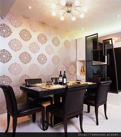 以鐵件及黑玻璃打造的屏風區隔玄關空間,並以印花壁紙界定餐廳區域。