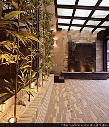 雖然前院最初設計是用來停車,但是若從客廳向外望時能有一窗風景必定能舒緩身心。設計師在前植栽一些雅緻的植物,並設計了一道水景牆,潺潺水流在燈光的照映下日夜都呈現不同風情。