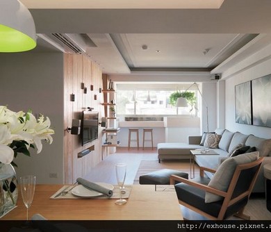 在「自然」的主軸下,大量使用木頭材質的建材,營造清新、不造作的氛圍。全屋鋪設實木地板,當赤腳踏在地板上時,能感覺到溫暖、舒服、自在;客廳的電視牆以梧桐木皮打造,牆面上並設置了露明CD架,除了可以隨手取得喜愛的CD,也讓原本單調的牆面多了活潑的裝飾。