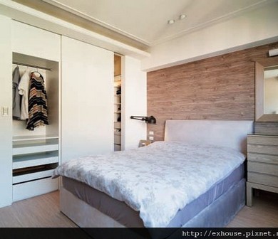 為了讓預算不超出屋主期待,運用PVC地磚做為主臥背牆材質,再藉由共用概念的設計,利用一扇拉門當作衣帽間與衣櫃的門片,兼顧生活便利性、美觀之餘,也省下一筆費用。