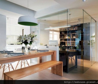 書房完全無框架的玻璃隔間,除了讓光線穿透,也省下一筆材料費用;書櫃則顛覆一般系統櫃作做法,以橫放堆疊的手法,加以跳色變化,製造視覺變化並省下木作支出。