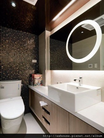將兩間衛浴外擴加大,增加空間寬敞性,客浴以局部跳色的馬賽克磚營造低調華麗感,鏡面則利用噴砂玻璃造型製造燈光變化;主浴浴缸上加設了實木托盤,可放置精油、書籍,增添泡澡樂趣。
