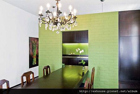 設計師重新定義居家空間,分成白天和夜晚活動兩大區域,白天活動的區域,指的主要是客廳、餐廳等公共領域,打開原本阻隔自然採光的隔間牆,客餐廳採取開放式設計,考量烹飪時的油煙氣味,廚房則採部分封閉式設計,餐廳和廚房之間鋪砌了一道成熟穩重的綠色磚牆,其上開了一扇方窗,牆面上方不到頂,維持空間的穿透性,設計師以一張從廚房窗檯延伸而出的大餐桌,串連三個空間的關係,同時也讓光線能更廣泛的在「白天活動區」恣意流動。