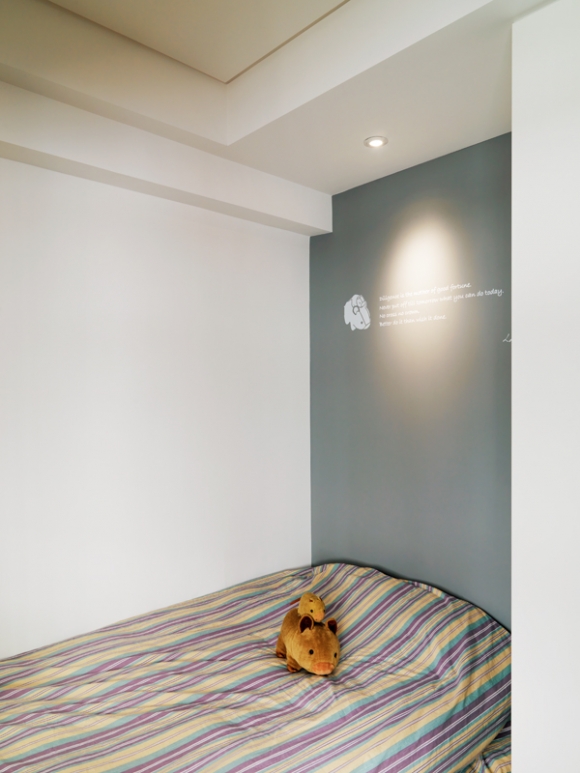 床頭背牆上特別以陪伴孩子長大的小豬玩偶做為圖騰造型,呼應生活回憶。
