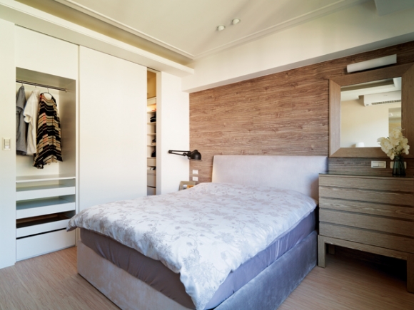 主臥背牆採用PVC地磚鋪設、更衣室與衣櫃共用拉門,都是省錢又實用的秘訣。