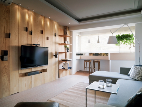 梧桐木皮結合溝縫設計的電視牆上,以露明手法收納CD,並成為牆面上的裝品。
