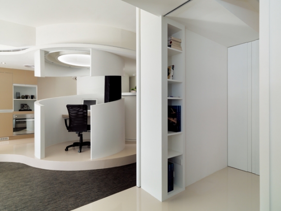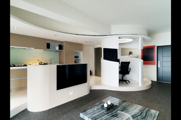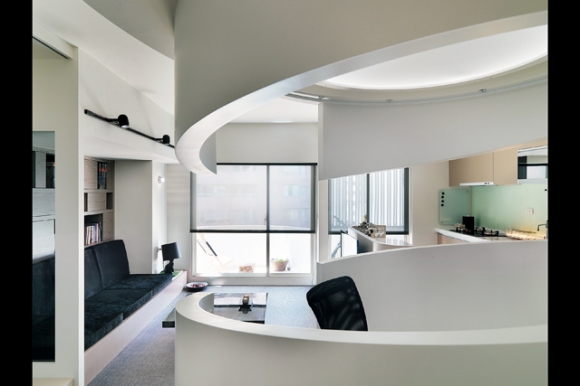 以屋如其人的想法,讓空間直接反映出居住者的特性,考量到屋子必須符合屋主或兒子回國時使用的雙用途,即以涵蓋創意元素的創意性設計,建造出適合屋主放鬆和延伸小空間視覺張力的兩人住宅。設計師打破方正格局難以消化的圓形結構,活絡空間意象,並讓小空間因「圓柱體錯覺論」營造出放大和膨脹效果。獨具巧思的特殊互動式設計,讓居住者能在空間內產生更多關聯性,增加生活感。