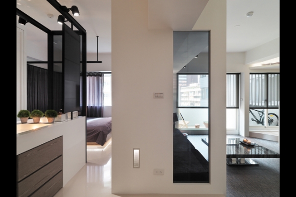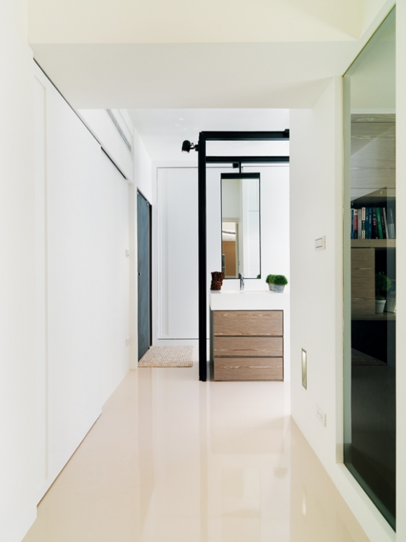 走入半開放式的臥房空間,是一長條型的廊道,左端為隱藏式的浴廁。