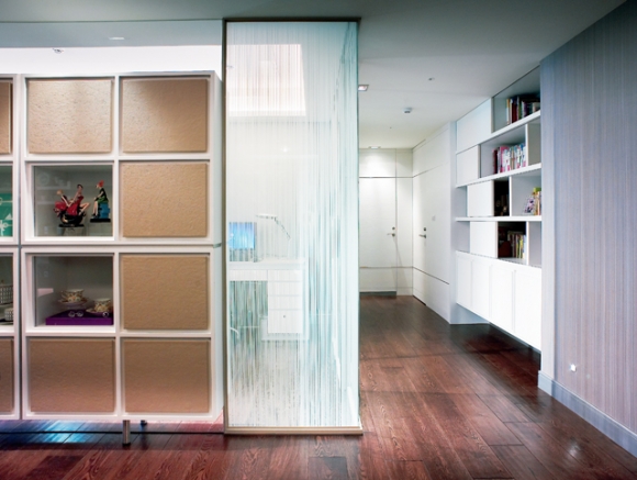 餐廳旁的收納展示櫃,黃千祝以女屋主最愛的愛馬仕概念皮革材質做為門片材質,透明的部分讓屋主作為收藏品的展示空間。後側則為書房空間使用的櫃體。