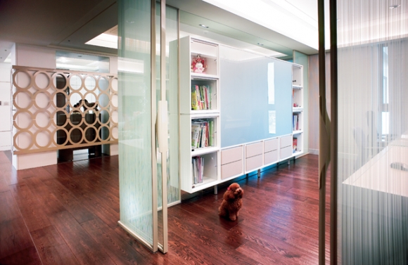 餐廳旁的收納展示櫃後方則為書房,雙面櫃設計滿足不同區塊性的使用機能。