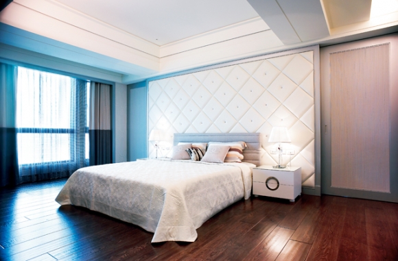 主臥房延續公共空間的淺色調,以優雅的皮繃布點綴主牆視覺。
