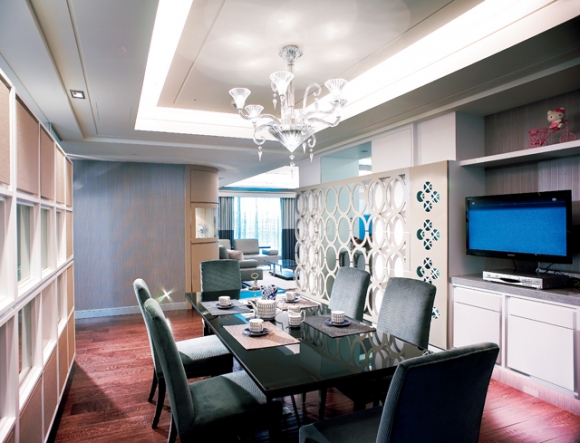 玄關雕刻噴漆鐵件屏風後方,設計師規劃為餐廳區,造型屏風設計也成為用餐時的視覺焦點風景!