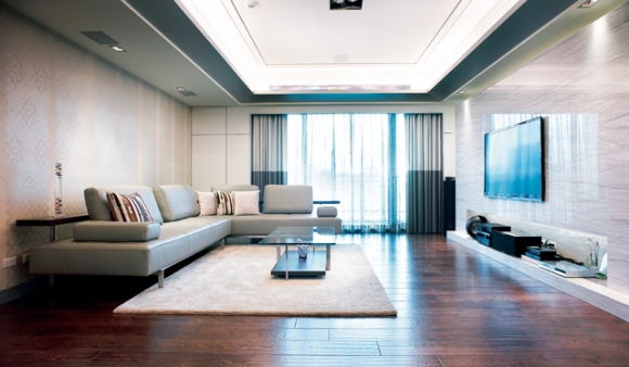 低調中顯現大器質感的淺色調空間,僅在電視牆運用大面積大理石石材。