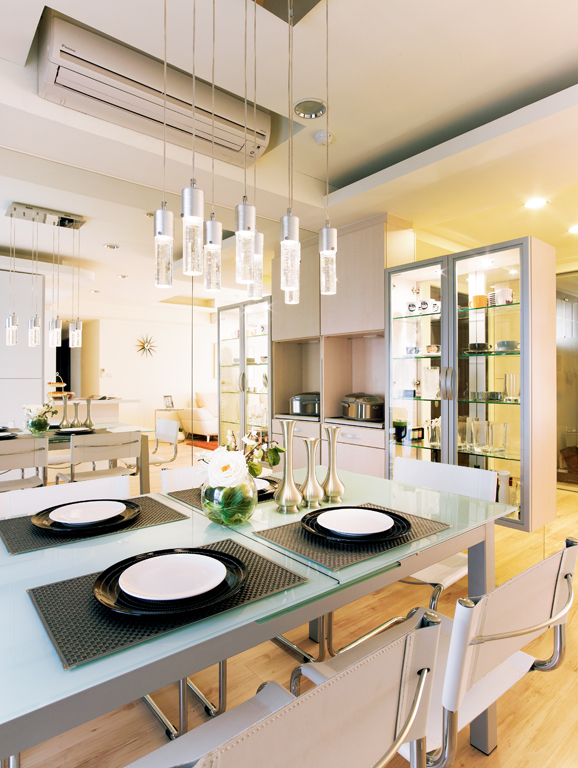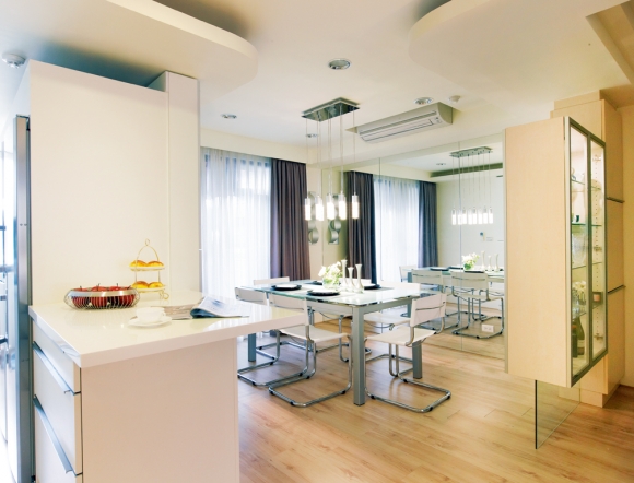 餐廳與廚房之間採用開放式的吧台設計,落地窗引進的自然光搭配明鏡,都讓空間感變大了。