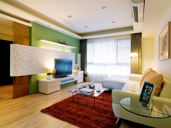 客廳以白色為基調,電視背牆的創意造型一路延伸到玄關,簡單又具吸睛效果。