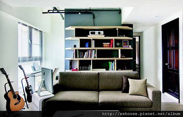 單身屋主在工作之餘有玩樂器的嗜好,因此在整體格局配置上,希望呈現一種不受拘束、且能彰顯性格的調調。先以顏色較淺的超耐磨地板替全空間打底,接著再以直紋的栓木皮與鐵灰搭配,藉由顏色與質地反差,創造出陽剛與溫潤並濟的印象。