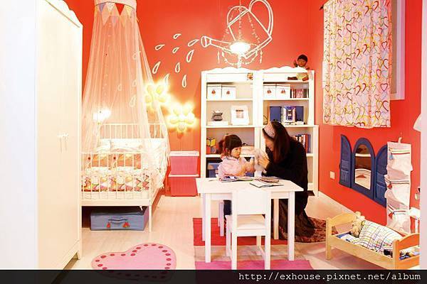 3至6歲的兒童房,一般建議可選用較鮮豔的壁面顏色,不但讓空間顯得活潑,也有刺激兒童視覺發展的作用。此處選用小女生普遍喜愛的桃紅色壁面作為空間主色調,搭配純白傢具,再加上粉紅色系地毯與寶藍色擺飾收納品做點綴,讓空間有繽紛感但不讓人感到躁動;薄布料製成的床頂篷為孩子創造出另一個私密空間,同時帶來夢幻童話感!