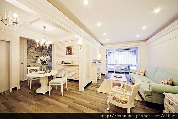 老房子裝修本來就花錢,加上屋主預算有限,設計師決定維持原格局不做大幅度的更動,由於前屋主已經將客廳陽台外推,為了讓長形客廳空間能有效的運用,設計師利用壁面的材質變化,將客廳區分為閱讀區、沙發區及展示區,其中展示區將來還可以放鋼琴做為琴區;而餐廳則規劃於客廳進入房間的走道,充份的運用空間;為了讓小空間也能展現出美式鄉村的風格,設計師選擇白為主色,從天花板延伸至壁面,並以比例合宜的傢具調整空間感,而美式鄉村常見的壁爐則做為電視櫃使用。