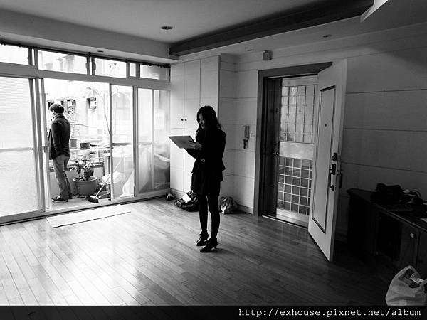 屋況:原有格局因為入門後的樑柱,客廳便因此有著奇怪的斜面牆,前陽台和後陽台相打通,成為一條戶外的無用長廊,然而當設計師要重整格局時,拆除牆面才發現多數磚牆竟為「空心磚」,便重新搭建磚牆,將陽台重新切割成三段,作為客廳、戶外陽台、工作陽台,客廳也順利避掉門後大柱。