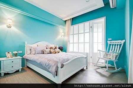 主臥室原本為暗房,設計師借衛浴空間造出一道格子窗門,再選擇TIFFANY 藍做鋪設,營造出浪漫無敵的幸福空間。