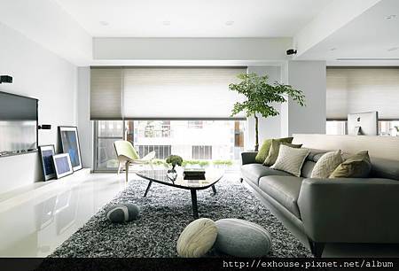 考量風水因素,入門玄關規劃半穿透屏風設計,客廳沙發靠窗側,延伸了一小段牆面留白處理,加上了綠樹盆景安排、仿石頭的抱枕佈置,為室內空間帶來難能可貴的自然綠意。