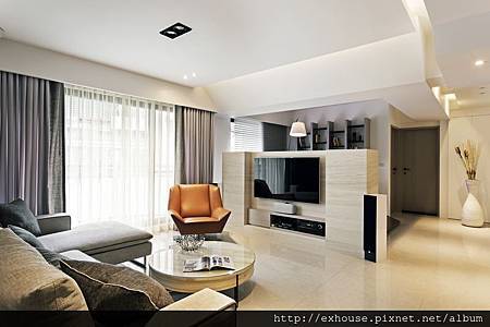 客廳主牆運用石材的自然紋理,以半開放式的方式設計,目的就是要增加空間延伸感與互動性。