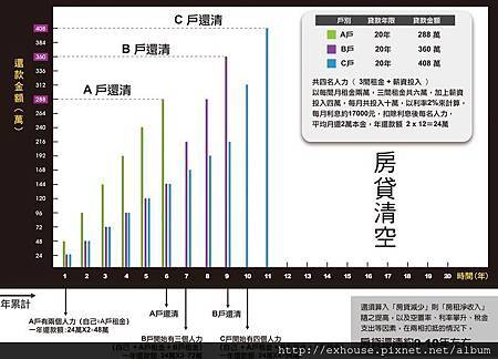 我選擇房貸最少的「A 戶」做優先償還,因為金額最少,清償耗時最短,當然清償A 戶的同時,B 戶、C 戶也在以各自的租金支付本身的房貸,所以執行以下「還款步驟」就可逐一將房貸還清: