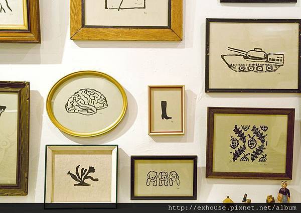 這面牆陳列著同一位藝術家的作品,它引人注目之處就是保持簡單。背景牆的顏色幾乎和畫作及油氈浮雕版畫的顏色融合一體,因此沒有其他東西可以減損它們的影響力。