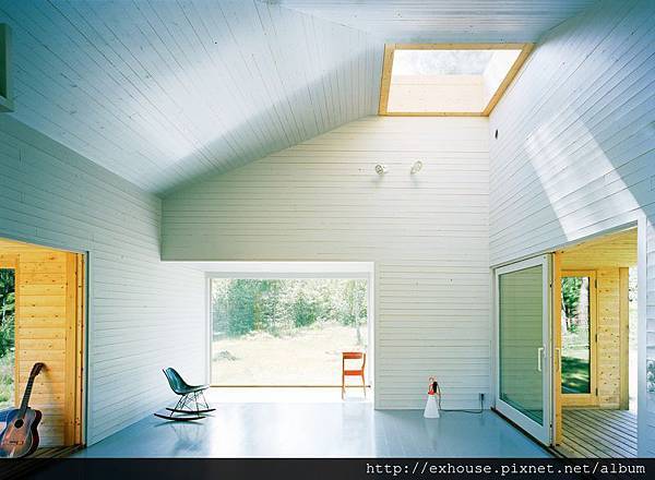 這個作為度假的木屋很不一樣的地方在於特殊長型結構中,有數塊的三角形陽台,主要是為了讓陽光的角度可以更容易進入室內,採取大面積的自然採光,為空間增添明亮和暖意,平時屋主也可以到屋外曬曬日光浴。
