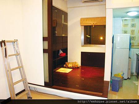 裝修前,「和室」的深色木地板,使客廳白色石英磚無法延伸,視覺被「分明的色系」截斷。