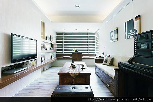 /設計師獻技/以具有比沙發略高隔板的書桌和造型櫃將閱讀區劃分出來,寬廣的桌面可放置電腦,亦可當作客廳的上網區,後方牆增設吊掛式的書櫃架,並在臨窗區域做一架高的休憩平台,提供另一閱讀的休閒區塊。