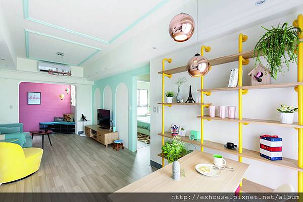 繽紛顏色的住家風格,以女生最愛的馬卡龍色系來妝點空間、牆面,再佐以粉嫩色的傢具、配件、燈具,整體空間讓人有如沐春天的感覺!
