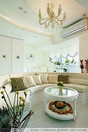 在一片素淨的白色空間中,軟裝佈置的用色也不能太過鮮豔,利用與白色呈協調色系的米色、駝色抱枕,搭配米白色燭台燈,替空間增添些許色彩。此外,因應客廳天花板設計,量身訂製半圓形沙發,再選擇圓形茶几,讓傢具造型與空間呼應。