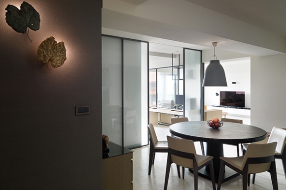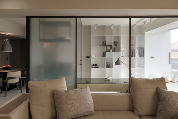 拆除的實牆改以清玻璃做為隔間,劃分出客廳後方的書房空間,強化與客廳之間的空間關係,也讓書房內獲得較充足而美好的採光,同時書房選用的風琴簾,經過濾後進入書房的光線讓書房一隅更有優雅的氣氛。擁有一大面書牆與懸吊展示鐵架,不僅僅滿足書籍、物品的收納需求,也是屋主生活品味的最佳呈現;書房與餐廳之間用通透的拉門做出區隔,維持家人間的對話方便性,關上後也保有使用空間的隱私,不干擾餐廳。
