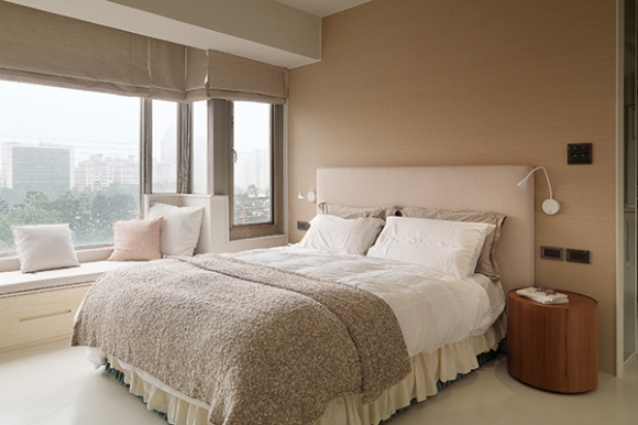 餐廳與廚房之間則配置深色門片做區隔,切分出清爽無油煙的用餐領域,清潔整理上更是容易;臥房配色同樣是淡雅自然的態度,窗邊配置一處臥榻區,不僅讓底座結合收納空間,更於角落做出靠背設計,增添寢臥的舒適度。而衛浴空間也極富生活情趣,無論是像VILA一樣可飽覽景色的抿石子泡澡區,又或者宛如度假飯店般的洗手台設計,都讓居家充滿悠閒、放鬆的氛圍!