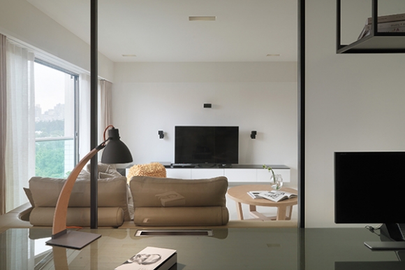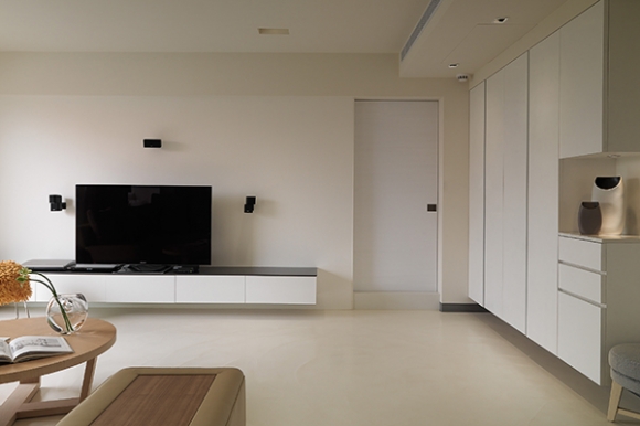 此案為一間45坪的老屋,將室內客廳一面牆拆除後,化解空間隔閡感之外,在白色基調下,也讓生活空間更加通透延伸,窗外採光更可無限的引入,型塑明亮而寬敞的公領域。電視牆則配置不落地視聽櫃,於白色背景上點綴黑色調,呈現極簡的對比美感,更符合業主對簡單生活的渴望;而家具、家飾則呈現駝色木質調,再搭配落地窗外的綠意植栽,與戶外風景形成契合畫面,更使生活空間多了份自然的愜意。